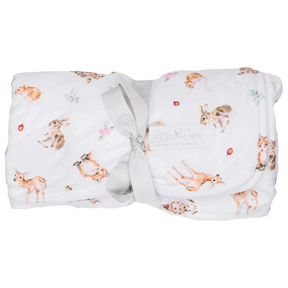A part of the Little Wren collection, this baby blanket is made from cotton and soft touch polyester and will make the most adorable addition to your little one’s wardrobe. Each blanket features an all over pattern on a white background with a soft touch reverse. The pattern features a variety of woodland animals such as fox cubs, bunny rabbits, deer and more.