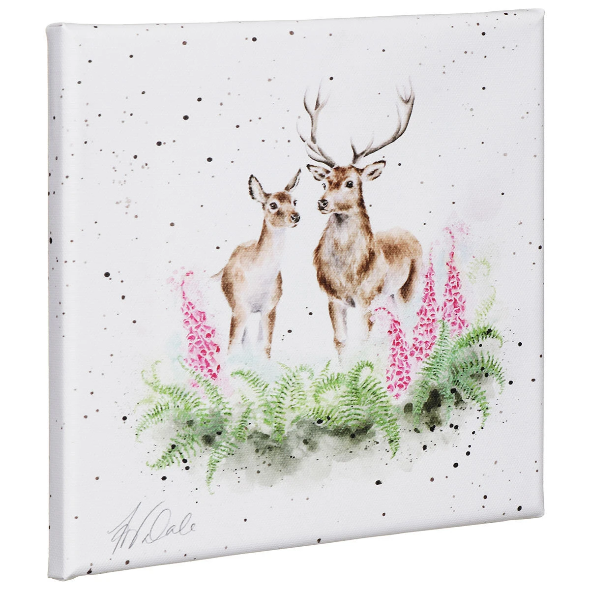 Set against a crisp white canvas, this painting features an endearing scene of two deer, one large proud looking male with large antlers, stood next to a beautiful female deer. They are surrounded by foxgloves and green foliage. The intricacy and detail of this piece of art will look wonderful hung on any wall.