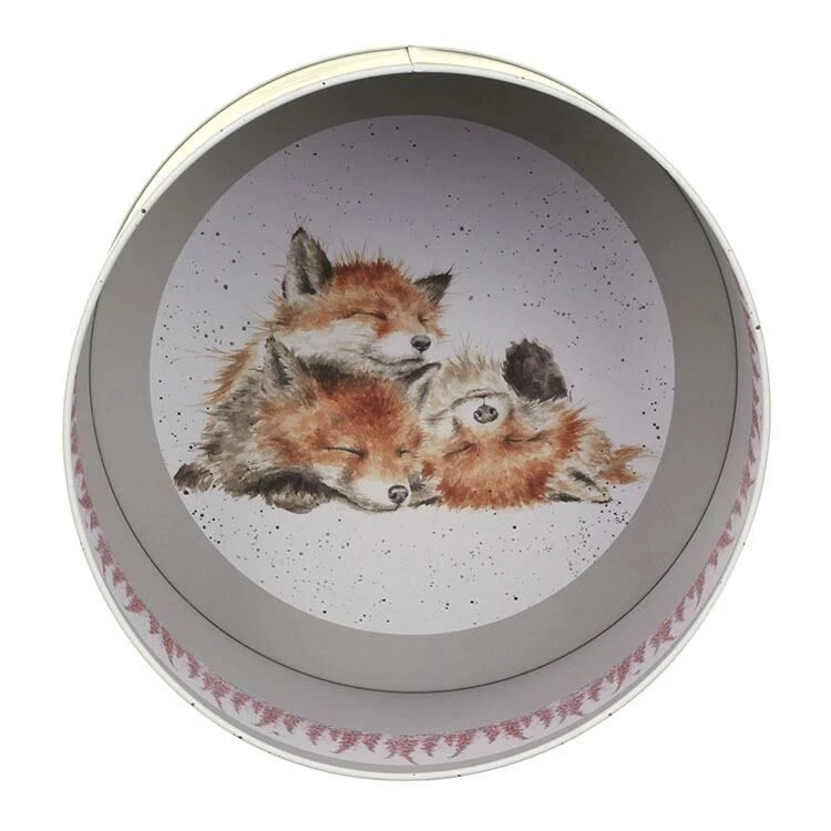 The lid of the medium tin features a painting of a fox, looking peacefully into the distance and surrounded by pink fox gloves amid soft paint speckling. The reverse of the lid, bottom of the base and exterior wall show designs of fox cubs, snoozing and playing with each other whilst the inside is printed with a banner of pink fox gloves, set against a soft grey background.