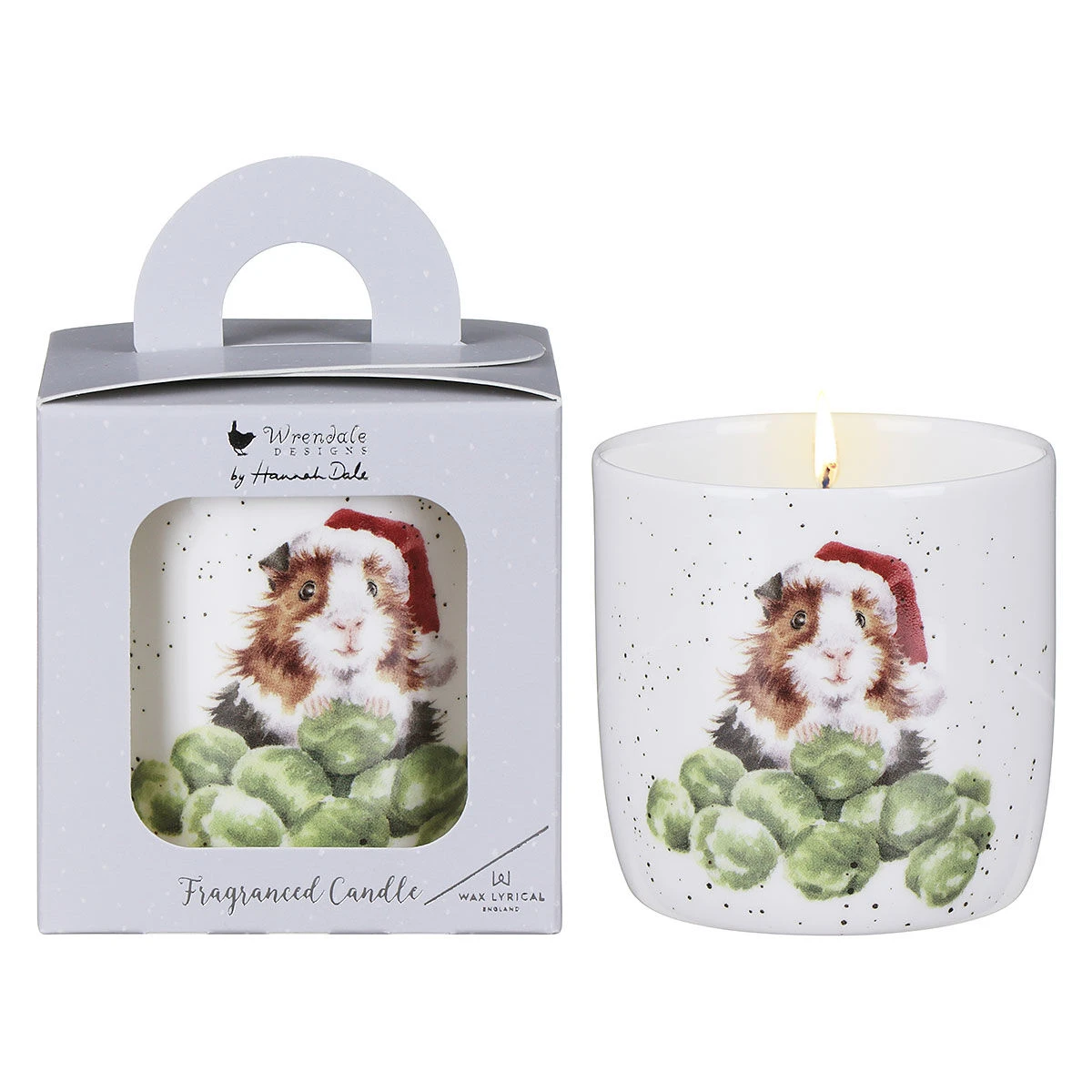 Made of ceramic, this candle depicts a wonderful illustration of a brown and white guinea pig surrounded by delicious, green Brussel Sprouts. This cute guinea pig looks happy to be surrounded by his snacks and is wearing a festive red and white Santa hat. This is all set against the crisp cream background. Around the guinea pig are interspersed speckles of black paint, in a way that is very synonymous with the Wrendale brand. The fragrance features fruity top notes of orange, lemon and blackcurrant that blend beautifully with the heart notes of rose, geranium and sage. The scent concludes with musky base notes of ylang ylang, pine and cedarwood that give the fragrance a beautiful bouquet of aromas.