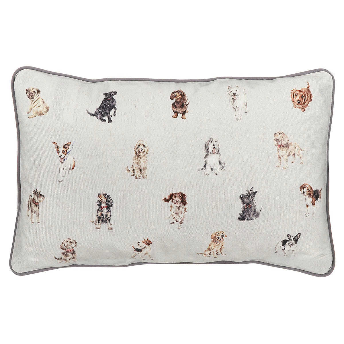 The front of this cushion is decorated with an endearing portrait of an adorable dachshund, painted in soft watercolour tones. The Dachshund is wearing a bright red collar, as he dashes excitedly towards something, with his big ears flopping behind him, and his glistening brown eyes gazing wide. The design is surrounded by the trademark black speckles that Wrendale are known for. The design is set on a beige cushion which is made of a cotton linen blend fabric, and it is filled with ethically sourced feathers. On the reverse of this cushion is an array of illustrations of other dog breads, displayed in a polka dot fashion across the beige canvas backdrop all in different poses and interspersed with small white dots. The cushion is finished off with a grey pied edge, a concealed zip fastening and the Wrendale branded tag.