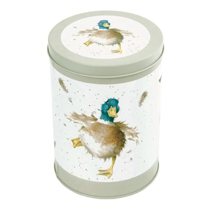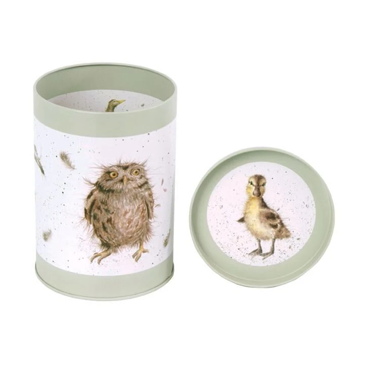 The outside of the canister features illustrations of animals from the award winning Country Set range. A hare sits on the ground, chewing some stems of grass. A slightly dishevelled Tawny Owl stands with ruffled feathers, some flying around him. A duck with widespread wings, a little lopsided as if he has just made a crash landing. The images are painted in soft hues, in the signature watercolour style of Wrendale designer Hannah Dale.Â