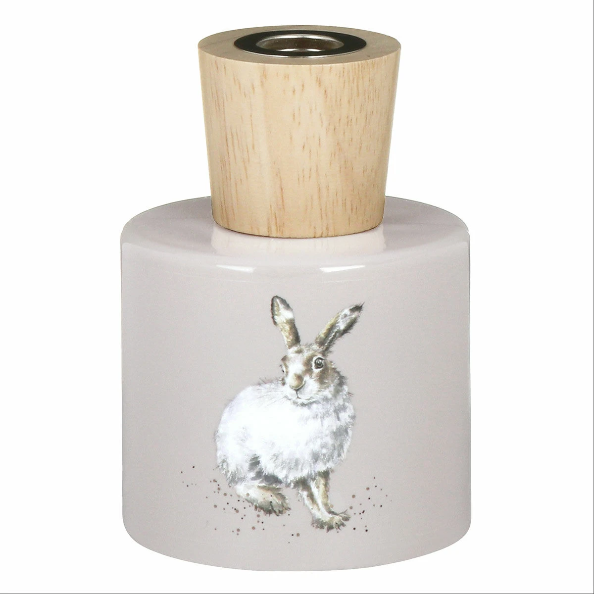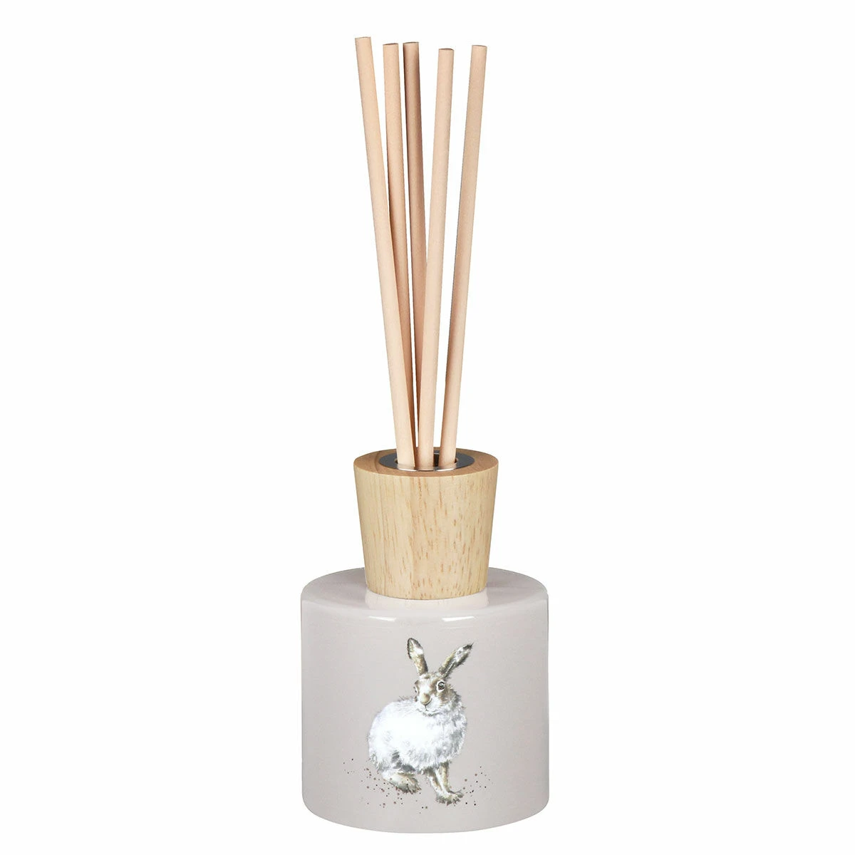 Featuring a delightful illustration from artist Hannah Dale, the glass vessel depicts the gorgeous ‘Winter Hare’ illustration which depicts a fluffy hare with its white winter coat. Snow falls around the hare and the design is accentuated with speckles of black paint, a small touch which is synonymous with the Wrendale brand. This is set against a pale grey background and the bottle is topped with a wooden bottle neck. Inside there are five natural brown reeds to diffuser the wonderful fragrance.