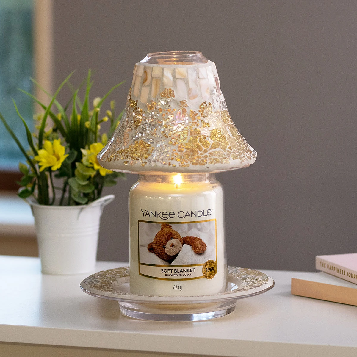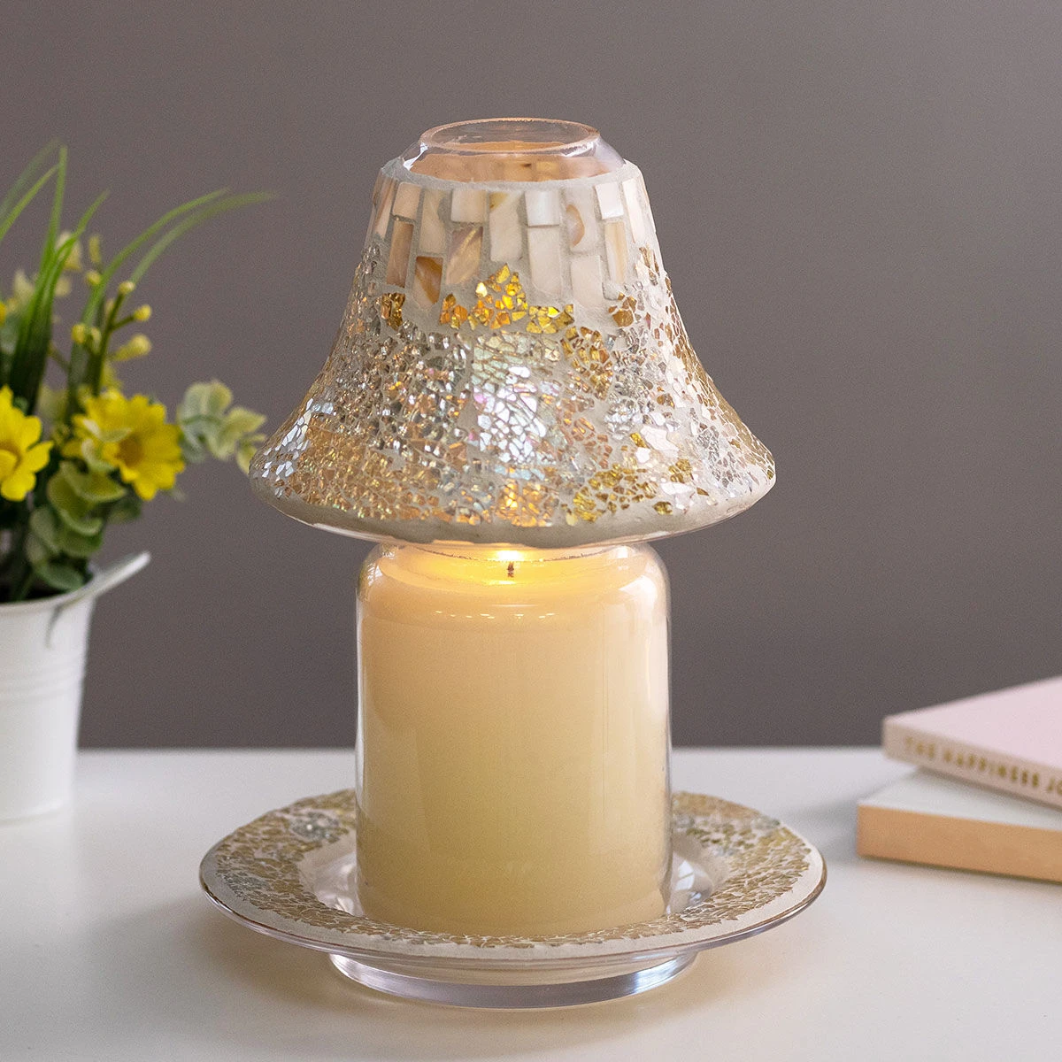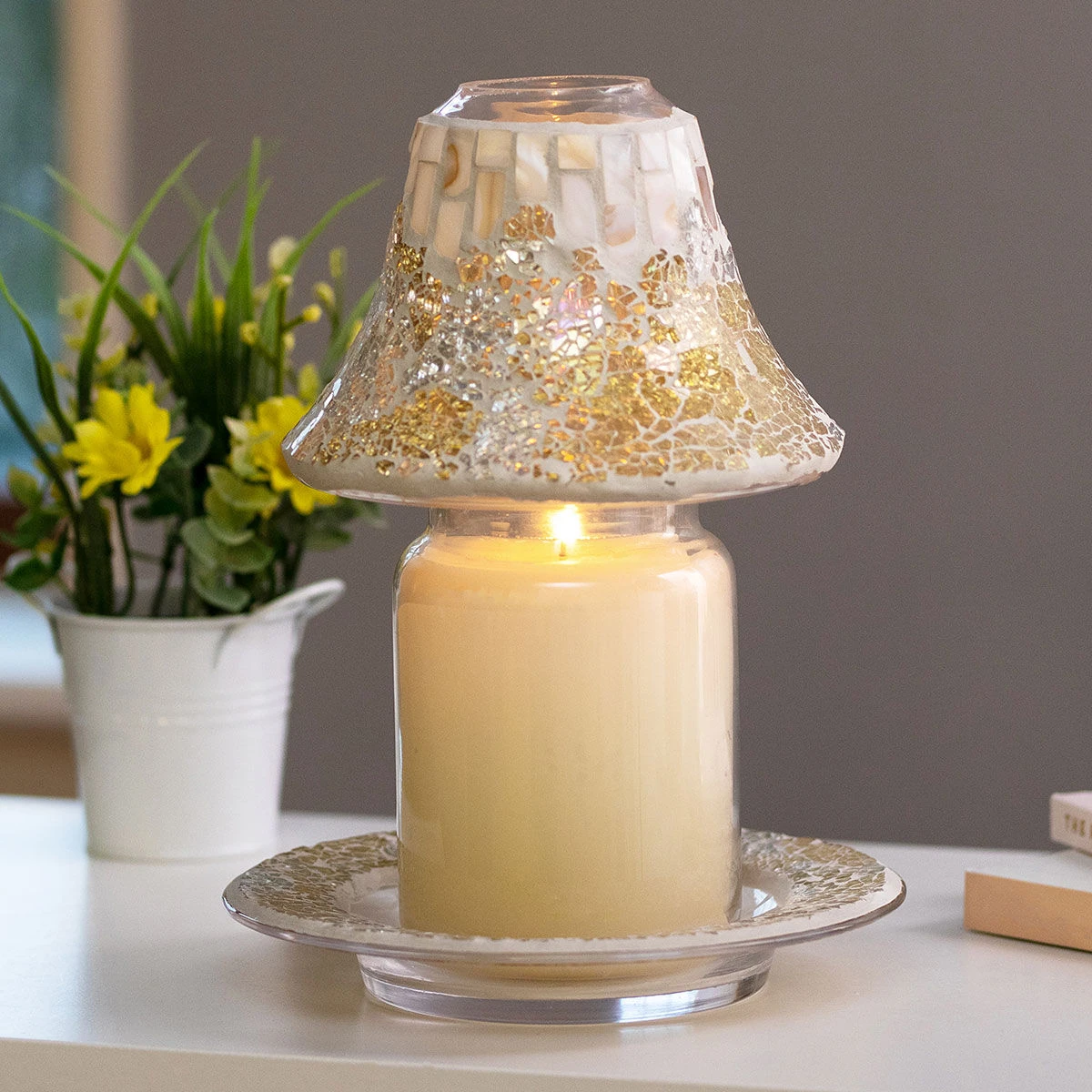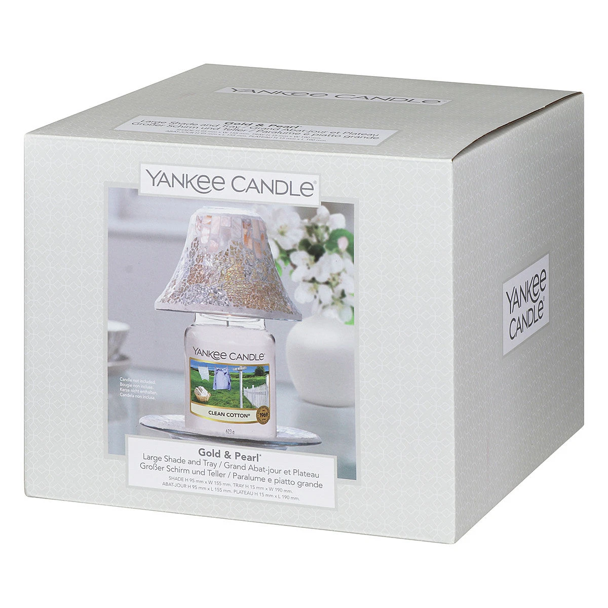 This boxed set contains both a Yankee Candle Shade and tray to accessorise your favourite fragrance with sparkling style. The tray acts as a decorative placement for any medium or large sized candle whilst also adding a secondary means of support. The shade casts a beautiful shimmering light when placed atop a lit candle, with the crackled fragments of coloured glass reflecting throughout the room, creating a soft ambience whilst you enjoy the serenity of your favourite fragrances.