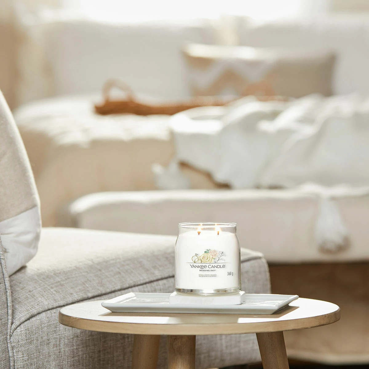Ideal for one of life’s most special moments… this Wedding Day fragrance from Yankee Candle is a floral fragrance brimming with class and bridal elegance. The sleek glass vessel of this Signature Medium Jar candle compliments the fragrance and will look wonderful in your home.